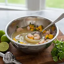 Ceviche (pronounced seh-vee-che) is a gem of Latin American cuisine, a dish whose roots trace back to the coasts of Peru. Its secret lies in the simplicity and freshness of the ingredients. Instead of cooking, seafood or fish are 'cooked' in citrus juice, most often lime juice. The acid denatures the proteins, causing the meat to become firm and opaque, just like after cooking. This version is a tropical variation of the classic, combining the sweetness of ripe mango, the heat of chili pepper, the crunch of red onion, and the freshness of cilantro. Creamy avocado perfectly balances the sweet-sour marinade known as 'leche de tigre' (tiger's milk). The dish is incredibly refreshing, light, and full of contrasting flavors and textures. It looks stunning, shimmering with the colors of pink shrimp, orange mango, and green garnishes. It is perfect as an elegant appetizer for summer gatherings or as a light, healthy lunch on a hot day.