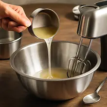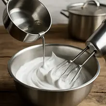 Chill the aquafaba and the bowl: place 240 ml of aquafaba in the refrigerator for 15–20 minutes before whipping. Chilled aquafaba whips up faster and gives a more stable foam. If you have a metal or glass bowl, put it in the fridge for a moment — a cold bowl helps with whipping.