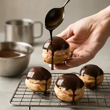 Prepare the chocolate glaze: break 120 g of dark chocolate and place it in a metal or glass bowl. Heat 40 ml of water or plant-based milk in a small saucepan until very hot (not necessarily boiling) and pour it over the chocolate, wait 30 seconds, then stir slowly until the mixture becomes smooth. Add 15 g of rapeseed oil and a pinch of salt, mix until you have a glossy, liquid glaze. If the glaze is too thick, add another 5–10 ml of hot water.