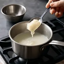 Heat the gelatin: transfer the swollen gelatin with the milk to a small saucepan and heat over very low heat, stirring constantly, until the gelatin is completely dissolved and the liquid is clear (about 30–60 seconds). Be careful not to bring it to a boil — a temperature at which the steam gently ripples is sufficient.