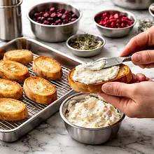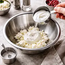 In a bowl, combine 150 g of soft goat cheese with 50 g of Greek yogurt. Add a pinch of salt (2 g) and 1 g of freshly ground pepper. Mix with a spoon or whisk until a smooth, creamy mixture forms — the consistency should be easy to spread, not runny. If the mixture is too thick, add a teaspoon of yogurt (about 5-10 g).