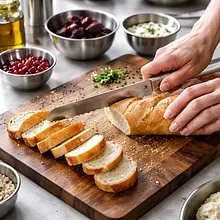 Slice the baguette into pieces about 1–1.5 cm thick (you should get about 10–12 slices from 200 g). Brush both sides with olive oil (15 g) using a brush or drizzle and rub a little oil with your hands. Arrange the slices on a baking sheet lined with parchment paper and place in an oven preheated to 200°C for 6-8 minutes, until golden and crispy. Alternatively, toast in a dry pan for 2-3 minutes on each side over medium heat.