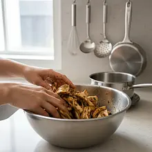Transfer the torn oyster mushrooms to a bowl with the marinade. Now for the most important part: gently but thoroughly mix the mushrooms with the marinade using your hands. Massage the sauce into each piece, ensuring that all strips are evenly coated. The mushrooms should become shiny and darker than the marinade.