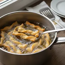 In a wide, large pot or deep skillet, heat the oil. There should be enough oil for the angel wings to float freely (at least 3-4 cm deep). The oil should reach a temperature of about 175-180°C. If you don't have a thermometer, drop a small piece of dough in – if it immediately rises to the surface and starts frying vigorously, creating bubbles around it, the fat is ready.