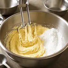 Cream the butter with powdered sugar: place the butter (200 g) in a large bowl, add the powdered sugar (100 g). Use a hand mixer or stand mixer on medium speed and beat for 3–4 minutes until the mixture becomes lighter, fluffy, and creamy. Scrape the mixture from the sides of the bowl with a spatula and continue beating for another 30 seconds. The mixture should be smooth and slightly fluffy — when you lift the mixer attachment, the mixture should flow in a thick, even stream.