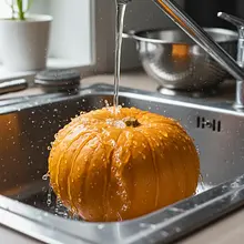 Dokładnie umyj dynię hokkaido pod bieżącą, zimną wodą, szorując jej skórkę. Osusz ją starannie ręcznikiem papierowym. Połóż dynię na stabilnej desce do krojenia i używając dużego, ostrego noża szefa kuchni, przekrój ją na pół. Za pomocą solidnej, metalowej łyżki energicznie wyskrob ze środka obu połówek wszystkie nasiona oraz włóknisty miąższ.
