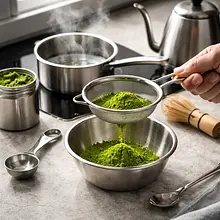 Prepare the matcha paste: sift 8 g of matcha into a small bowl to remove lumps. Heat 40 ml of water to about 70-80°C (not boiling). Pour 40 ml of water into the bowl with matcha and vigorously whisk with a bamboo whisk (chasen) or a small whisk for about 30-45 seconds until a smooth, slightly frothy paste without lumps forms. The paste should have a vibrant green, uniform color and a slightly creamy consistency.