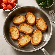 Toast the baguette slices: you have two options — oven or skillet. In the oven: preheat to 200°C (top and bottom heat). Arrange the slices on a baking sheet lined with parchment paper and drizzle them very lightly with oil (about 5 g per side) or brush them. Bake for 6–8 minutes, turning once, until golden and crispy. In the skillet: heat a dry heavy-bottomed skillet over medium-high heat and toast the slices for 2–3 minutes on each side until golden.