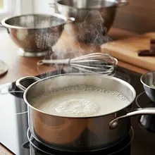When the milk in the pot starts to boil (you will see steam rising and small bubbles at the edges), reduce the heat to the minimum. While continuously stirring the hot milk with a whisk, slowly pour in the mixed pudding powder in a thin stream. Do not stop stirring vigorously! Cook the mixture for about 1-2 minutes until the pudding thickens noticeably and starts to 'bubble'. Remove the finished, thick pudding from the heat.