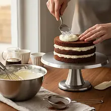 On the platter or plate where you will serve the cake, spread a little cream in the center. Place the first layer of cake on it - this will prevent the cake from sliding. Spread an even layer of cream on the layer (about 2-3 full tablespoons). Use a curved spatula or the back of a spoon to spread the cream all the way to the edges.