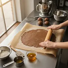 Take one ball of dough and place it on a sheet of baking paper. Roll it out very thinly, to a thickness of about 1-2 mm, into a circle slightly larger than 24 cm in diameter. The dough is flexible, but if it sticks, you can lightly dust the rolling pin or the dough with flour. From the bottom of a 24 cm springform pan or from a large plate, trace a circle, and then cut it out with a pizza cutter or a regular knife. Do not remove the scraps - they will bake along with the base.