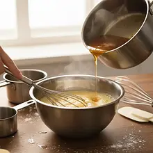 Prepare a water bath. Pour water into a larger pot to a height of about 3-4 cm and bring it to a boil. Reduce the heat so that the water is just gently simmering. Place a smaller pot or metal bowl on top of the larger pot, ensuring that the bottom does not touch the water. Add butter, sugar, and honey to the bowl. Heat, stirring occasionally with a spatula, until all the ingredients melt and combine into a smooth, liquid mixture. This should take about 5-7 minutes.