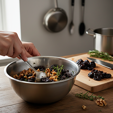 Prepare the filling. Coarsely chop the walnuts and dried plums. In a bowl, mix them together. Spread the prepared filling evenly on the inner surface of the meat fillet. Then roll the tenderloin back into a tight roll. Tie the roll in several places with kitchen twine to maintain its shape during baking.