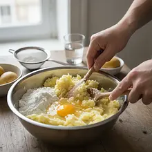 Add the semolina flour, potato flour, eggs, and a pinch of salt to the pressed potatoes. Start kneading the dough with your hands. At first, it will be sticky, but as you knead, the flour will combine with the potatoes. Knead quickly and efficiently, just until the ingredients come together into a smooth, elastic ball that doesn't stick to your hands. This process should take no more than 3-4 minutes.