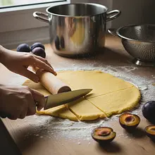 On a lightly floured countertop, shape the dough into a roll about 5-6 cm thick. Cut it with a knife into equal slices about 1.5 cm thick (you should get about 12-15 pieces). Take each slice in your hands and flatten it into a round disc with a diameter of 8-10 cm. Place one plum in the center of each disc. Then, carefully pinch the edges of the dough over the plum to form a ball. Make sure to seal all the seams well, and then gently roll the dumpling in your hands to give it a perfectly round shape. Ensure there are no cracks.