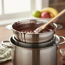 Prepare a water bath to melt the chocolate. Pour water into a small pot to a height of about 2-3 cm and bring to a boil. Reduce the heat so that the water is just simmering. Place a metal or glass bowl on top of the pot that is larger than the diameter of the pot and does not touch the surface of the water. In the bowl, add the broken 70% dark chocolate and 120g of diced butter. Slowly stir with a silicone spatula until the ingredients are completely melted and combined into a smooth, glossy mixture. Remove the bowl from the pot and set aside to cool slightly for about 5-10 minutes.