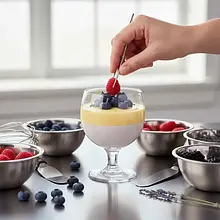 Remove the desserts from the refrigerator. Arrange fresh berries – raspberries, blueberries, or sliced strawberries – aesthetically on the surface of the set mousse. Then, very slowly and carefully pour the cooled agar jelly over the fruits. Place the dessert back in the refrigerator for the last time, for about 1 hour, until the jelly is completely set.