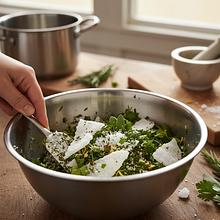 In a large, dry bowl, place the coarse sea salt. Add all the chopped herbs, garlic paste, and grated lemon zest. Now for the most important part – using your hands, start rubbing all the ingredients into the salt. Do this for 3-4 minutes, crushing the salt crystals with the herbs between your fingers. The salt will begin to absorb moisture and essential oils, changing color to a vibrant green and taking on a moist consistency resembling wet sand.
