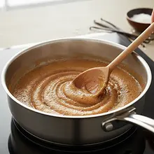 In a small, dry skillet or a saucepan with a thick bottom, place 100g of brown sugar. Heat over medium heat, without stirring, until the sugar melts and turns into a liquid, dark caramel. When the caramel starts to smoke, carefully pour in about 100 ml of the previously prepared wort (bread liquid). Be careful, it will splatter a lot! Stir vigorously until the caramel completely dissolves in the liquid. Pour the caramel solution into the rest of the wort and add the remaining 50g of sugar. Stir until dissolved.