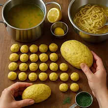 Delicate, wide egg noodles made from scratch, designed for classic broth, but with a distinctive, fresh lemon-dill twist inspired by Olga Smile's style. This soft, yellow pasta has a delicate texture that perfectly absorbs the aromas of the broth while maintaining its elasticity. Served in a clear chicken or vegetable broth, it creates a harmonious composition — visually appetizing ribbons (about 6–8 mm wide) with tiny green "dots" of dill and a subtle lemon zest that brightens the flavor. Perfect for a family dinner, Sunday broth, or when you want to elevate a classic soup with homemade, aromatic noodles.
