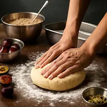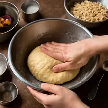 Prepare the starter: heat the milk to a temperature of about 35-38°C (it should be warm but not hot — check on your wrist). Crumble the fresh yeast into a small bowl, add 1 tablespoon (about 12 g) of the sugar from the list and pour in 50 ml of warm milk. Mix with a fork until the yeast dissolves and set aside in a warm place for 8-10 minutes. After this time, a foam should appear on the surface and you should smell the yeast, which indicates activation.