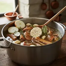 During the first hour of cooking, gray foams, known as scum, will form on the surface. These are coagulated proteins. Regularly and gently skim them off with a slotted spoon or a small sieve. Try not to stir the contents of the pot to avoid clouding the liquid. After about an hour, the scum will stop appearing.