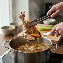 After cooking is finished, turn off the heat. Using tongs and a slotted spoon, very gently remove all solid ingredients from the pot: meat, bones, and vegetables. Do this slowly to avoid disturbing the sediment at the bottom. Strain the remaining liquid through a fine sieve lined with a double layer of cheesecloth or a clean cotton cloth. Pour the broth into a clean container or jars.