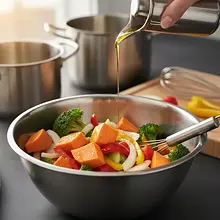 In a small jar with a lid, place all the sauce ingredients: 30 ml of olive oil, 30 ml of freshly squeezed lemon juice, 2 teaspoons of Dijon mustard, 2 teaspoons of honey or maple syrup, a pinch of salt and pepper. Close the jar and shake it vigorously for about 30 seconds, until the ingredients combine into a smooth, uniform emulsion. The sauce should thicken slightly and have a creamy consistency. Taste and adjust seasoning if necessary.