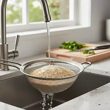 While the chicken and vegetables are baking, cook the quinoa. Rinse 200g of quinoa in a fine sieve under cold running water very thoroughly. Rinse for about a minute, rubbing the grains with your hand. This step is crucial to remove saponins, which give a bitter taste. Transfer the rinsed quinoa to a small pot, add 400 ml of cold water (ratio 1:2), and add a pinch of salt. Bring to a boil, then reduce the heat to the minimum, cover the pot, and cook for about 15 minutes, until all the water is absorbed. Remove the pot from the heat and let it sit covered for another 5-10 minutes. Finally, gently fluff the quinoa with a fork.