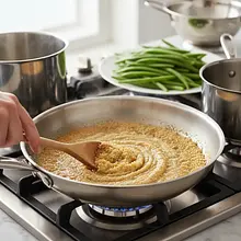 Do gorącego, pieniącego się masła wsyp bułkę tartą. Zmniejsz moc palnika do minimum i ciągle mieszając, smaż bułkę tartą przez około 2-3 minuty. Bułka powinna wchłonąć masło i zrumienić się na piękny, złoty kolor. Musisz być bardzo czujny, ponieważ bułka tarta bardzo szybko się przypala. Gdy tylko osiągnie pożądany kolor i zacznie intensywnie pachnieć, natychmiast zdejmij rondelek z ognia. Jeśli używasz opcjonalnego czosnku, dodaj go na ostatnie 30 sekund smażenia, aby tylko uwolnił aromat, ale się nie spalił.