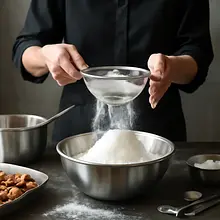 When the angel wings cool to a slightly warm temperature (not hot), sift 80 g of powdered sugar generously through a sieve directly onto the angel wings, creating an even "snowy" layer. If you want to add vanilla flavor, you can mix the powdered sugar with the remaining vanilla sugar before sifting.