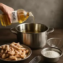 Pour 1000 ml of rapeseed oil into a large, deep pot — it should have a layer of about 6-8 cm so that the angel wings can float freely. Heat the oil to a temperature of 170-180°C. If you don't have a thermometer, check with a piece of dough: place a small piece in — if bubbles appear immediately and the dough browns quickly (within 30-40 seconds), the oil is ready.