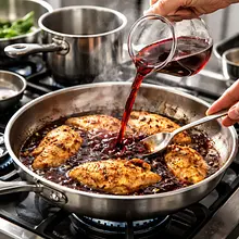 Delicate chicken breast fillets sautéed to a golden brown, served with a velvety sauce made from red wine, broth, and cream. The dish has a spicy-wine aroma, rich color, and an elegant, glossy sauce texture that perfectly complements the tender meat. This dish comes from European cuisine inspired by French techniques — classic "pan sauce" using wine reduction. It is perfect for a Valentine's dinner, served with mashed potatoes, risotto, or polenta, along with braised vegetables. The flavor profile is a balance between the acidity of the wine, the gentle sweetness of the sautéed shallots, and the creaminess of the butter and cream. Visually, the dish presents elegantly: juicy fillets, dark glossy sauce, and a green touch of parsley.