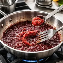 Add tomato paste (20 g) and mix thoroughly with the reduced wine for about 1 minute. Then pour in the chicken broth (200 ml), add a sprig of thyme (5 g) and bay leaf (2 pieces). Bring to a gentle boil, reduce the heat, and cook for 8–10 minutes until the sauce thickens slightly and the flavors meld.