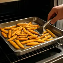Bake in the oven for 30-35 minutes, turning the fries halfway through the baking time, until golden and crispy.
