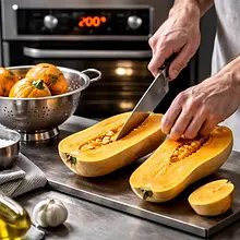 Preheat the oven to 200°C (top-bottom). Wash the pumpkin, cut off the ends, slice it in half lengthwise, scoop out the seeds with a spoon and set the seeds aside for roasting (optional). Do not peel the pumpkin if it has a thin skin; if the skin is hard, peel it with a peeler. Cut the flesh into cubes about 2-3 cm on each side. Place the pieces on a baking sheet lined with parchment paper, drizzle evenly with rapeseed oil (use a brush or a sprayer), and spread them out in a single layer.
