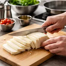Cut the halloumi into slices about 7-8 mm thick. Heat a grill pan or a regular non-stick pan over medium-high heat (preferably 26-28 cm). Drizzle a little olive oil (a few grams) in the pan, place the halloumi slices, and fry for 2-3 minutes on each side until golden, distinct stripes appear and the cheese becomes crispy on the outside while remaining soft in the center. Once cooked, transfer to a plate to cool slightly (2-3 minutes). Halloumi can be served warm or at room temperature.