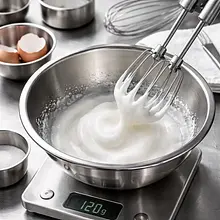 Prepare the meringue: in a clean, dry bowl (steel or glass), place the egg whites (120 g — about 2 large eggs). Add 1/3 of the honey (reserve the rest for sweetening the cider) and 1/2 teaspoon of ground cardamom (1 g). Whip with a hand mixer on medium speed for the first 1–2 minutes until foamy, then increase the speed and continue whipping for another 2–3 minutes until soft peaks form — the meringue should be shiny, stable, slightly thick, and hold its shape. The meringue should not be dry or grainy.