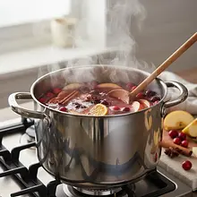 Place a pot on the stove over medium heat. Heat the punch until it is very hot and small bubbles begin to appear on the surface. At this point, immediately reduce the burner to the lowest setting. Cover the pot with a lid, leaving a small gap, and cook on very low heat for about 20-25 minutes. The goal is for the drink to gently 'simmer' rather than boil. This allows the flavors and aromas of the spices to slowly infuse into the liquid.