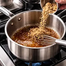 Prepare the caramel sauce: in a heavy-bottomed saucepan, heat 60 g of brown sugar over medium heat. Do not stir with a spoon right away — you can gently shake the pan to allow the sugar to melt evenly. When the sugar has dissolved and has taken on an amber, golden-brown color (this takes about 5–8 minutes), remove the saucepan from the heat and very carefully pour in 120 ml of cream (it will bubble). Return to low heat and add 20 g of butter and 20 g of honey, stirring until the sauce is smooth. Finally, add 5 g of vanilla extract and 1 teaspoon of orange juice, and mix.