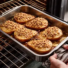 Bake the pears for 25–30 minutes at 190°C until the crumble is golden brown and the pears are soft when pierced with a thin knife (the knife should go into the thickest part with slight resistance but not with difficulty). If the crumble browns quickly, loosely cover the dish with aluminum foil after 15–18 minutes.