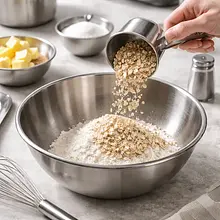 Prepare the crumble: in a large bowl, combine 100 g of all-purpose flour, 50 g of rolled oats, 80 g of chopped walnuts, and 100 g of brown sugar. Add 80 g of cold butter, cut into cubes. Use your fingers, two knives, or a pastry cutter to rub the butter into the dry ingredients until the mixture resembles coarse sand with a few larger clumps about 5–8 mm. The crumble should hold together when squeezed in your hand, but not form a uniform mass.