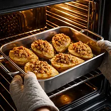 Place the dish in the preheated oven (middle rack). Bake for 25–30 minutes at 180°C, until the crumble turns golden and the pears are soft — you can check this by inserting a skewer or thin knife into the largest half: it should go in smoothly but not cause the fruit to fall apart. If the pears are very hard, bake for 35–40 minutes and cover the crumble with aluminum foil for the last 10 minutes to prevent the top from burning.