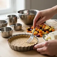 Take the chilled dough out of the fridge. Dust the work surface with a little flour and roll out the dough into a circle about 3 mm thick. Using a bowl or a rim, cut out 4 circles with a diameter larger than the diameter of the tartlet molds (about 12-14 cm). Gently press the dough into 4 tartlet molds with a diameter of 10 cm, pressing the dough against the bottom and sides. Trim off the excess dough with a knife.