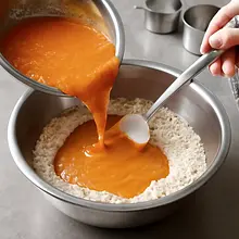 Pour the wet mixture into the bowl with the dry ingredients. Use a spatula or spoon and gently mix only until the dry ingredients are no longer visible — the batter should be thick but flow off the spoon. Do not overmix (a maximum of 20-30 turns with the spatula). If you see dry lumps of flour, gently break them apart.
