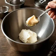 In a large bowl, sift 300 g of wheat flour and add 10 g of baking powder and 3 g of baking soda. Add 2 g of salt, 4 g of cinnamon, 2 g of ginger, and 1 g of nutmeg. Gently mix the dry ingredients with a wooden spoon or whisk to evenly distribute the spices in the flour.