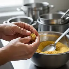 Moisten your hands with a little water so the mixture doesn't stick to them. Use a teaspoon to scoop small portions of the mixture (about 20-25g each) and roll them in your hands, forming neat balls the size of a walnut. Try to make all the balls similar in size.