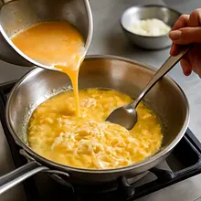 Pour the eggs into a heated pan with butter. Cook, gently stirring, until they start to set.
