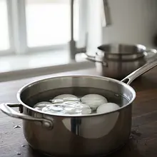 Place 6 eggs in a single row at the bottom of a medium pot. Cover them with cold water so that they are completely submerged (the water should be about 2 cm above the eggs). Put the pot on the stove over high heat. When the water starts to boil, reduce the heat to medium and cook the eggs for exactly 9 minutes. After this time, immediately remove the pot from the heat and cover the eggs with very cold water and ice. Leave them in the cold water for 10 minutes to cool completely.