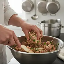 Now comes the most important moment – kneading the mixture. With clean hands, thoroughly mix all the ingredients in a bowl until the mixture is uniform and compact. Do not knead it for too long; 2-3 minutes is enough, otherwise the meatballs may become tough. Next, wet your hands with cold water (this will prevent the meat from sticking) and form equal balls the size of a walnut from the mixture. You should get about 16-20 meatballs. Place them on a cutting board or a large plate.